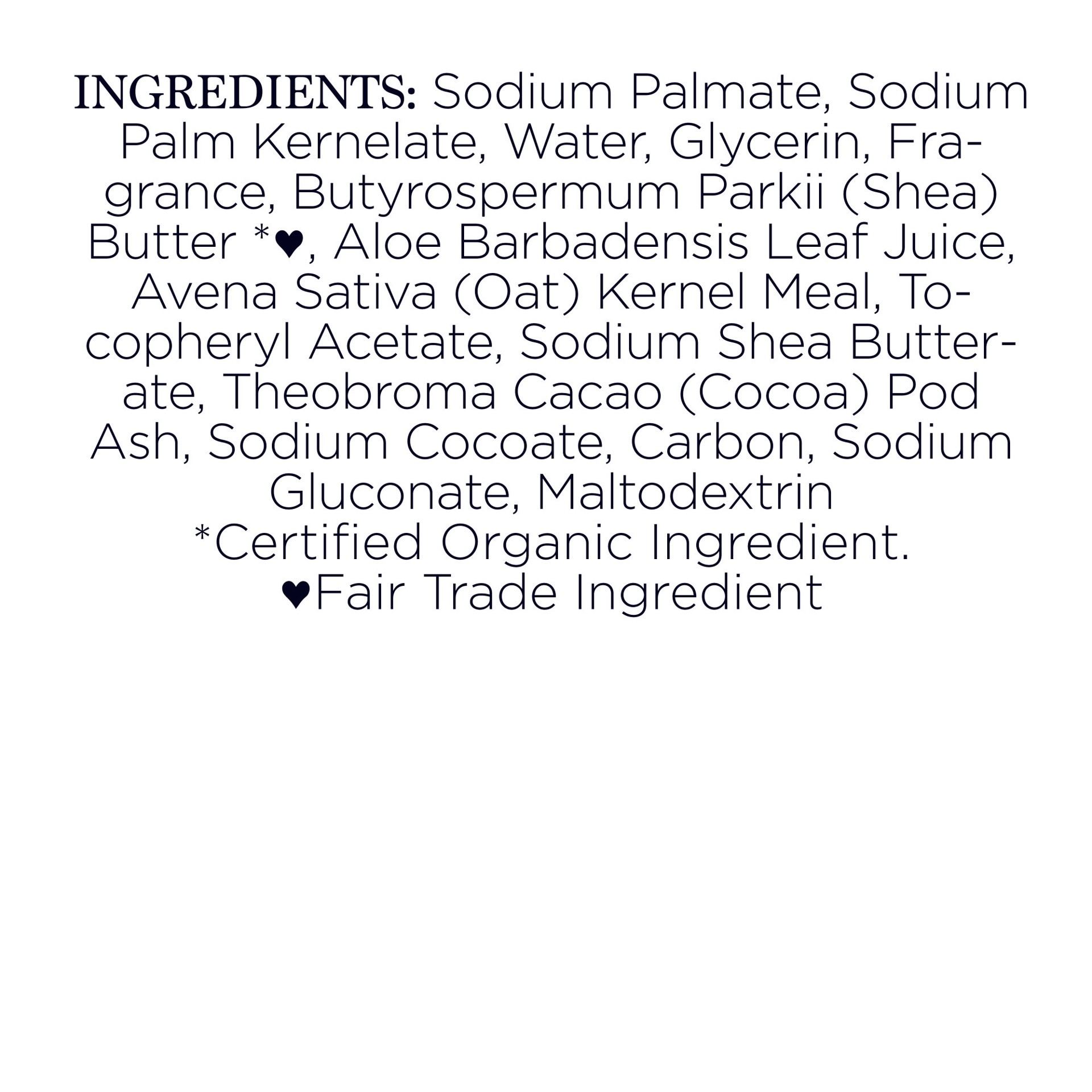 Sodium Palmate, Sodium Palm Kernelate, Water, Glycerin, Fragrance, Butyrospermum Parkii (Shea) Butter, Aloe Barbadensis Leaf Juice, Avena Sativa (Oat) Kernel Meal, Tocopheryl Acetate, Sodium Shea Butt…