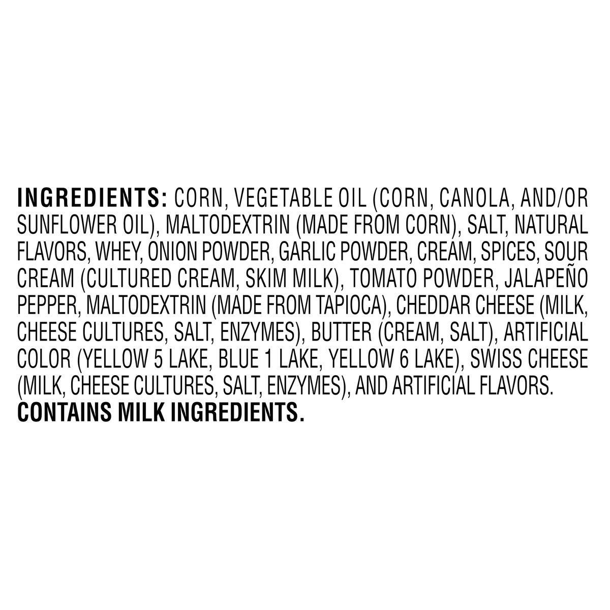 Corn, Vegetable Oil (Corn, Canola, and/or Sunflower Oil), Maltodextrin (Made from Corn), Salt, Natural Flavors, Whey, Onion Powder, Garlic Powder, Cream, Spices, Sour Cream (Cultured Cream, Skim Milk)…