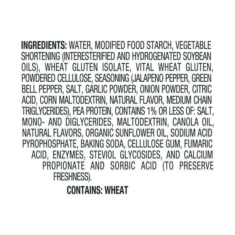 WATER, MODIFIED WHEAT STARCH, VITAL WHEAT GLUTEN, WHEAT GLUTEN ISOLATE, VEGETABLE SHORTENING (INTERESTERIFIED AND HYDROGENATED SOYBEAN OILS), SALT, JALAPENO PEPPER, DISTILLED MONOGLYCERIDES, CORN MALT…