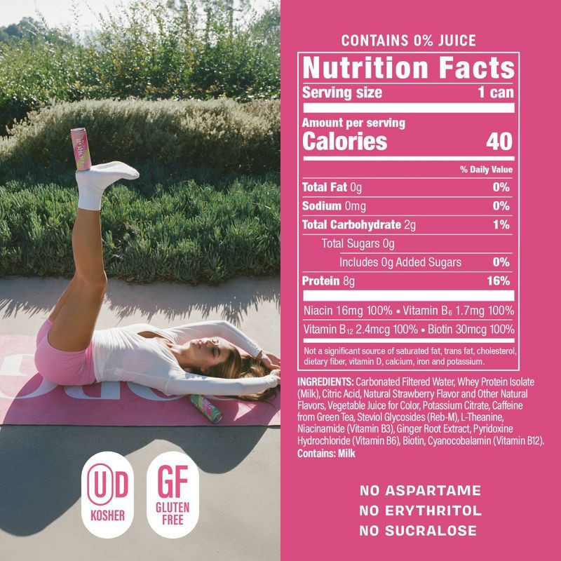 Carbonated Filtered Water, Whey Protein Isolate (Milk), Citric Acid, Natural Strawberry Flavor and Other Natural Flavors, Vegetable Juice for Color, Potassium Citrate, Caffeine from Green Tea, Steviol…