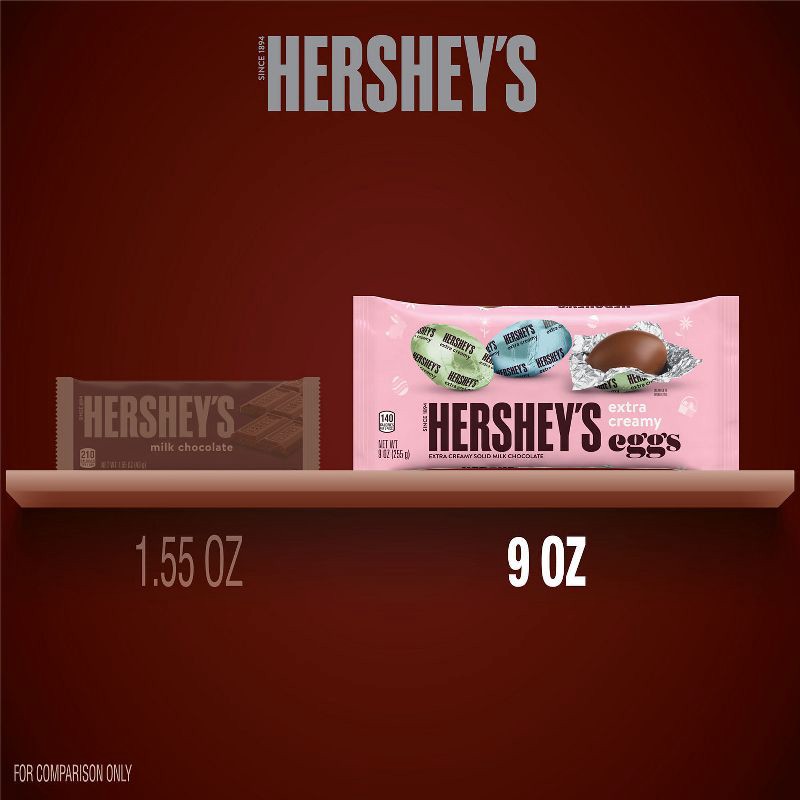 - Contains one (1) 9-ounce bag of HERSHEY'S Extra Creamy Milk Chocolate Eggs Easter Candy