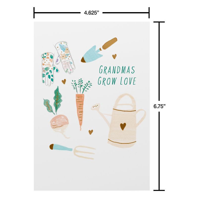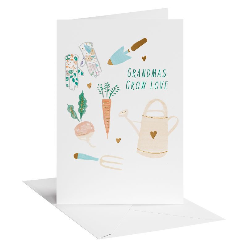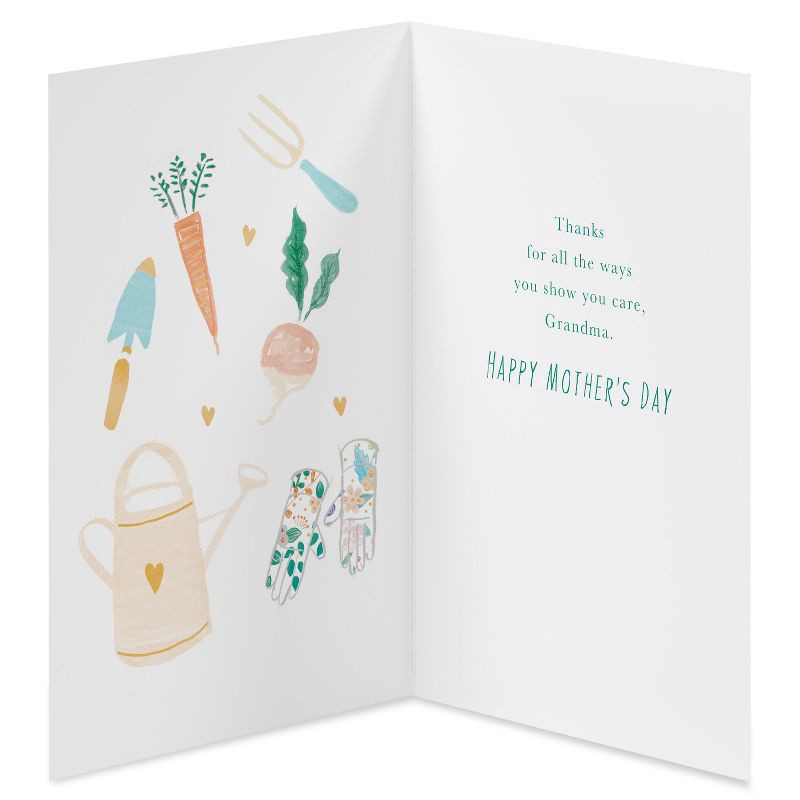 - DESIGN & FINISHINGS: This Mother's Day card beautifully showcases watercolor gardening icons from carrots to watering cans, each element lovingly painted to symbolize a grandmother's nurturing love.
