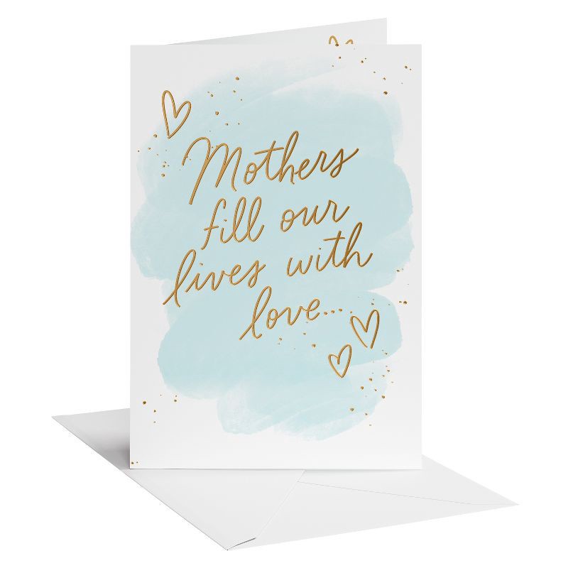 - DESIGN & FINISHINGS: This Mother's Day card features elegant gold script and hearts on a serene watercolor background. Luxurious gold splatter adds a touch of glamour, making it a visually stunning piece.