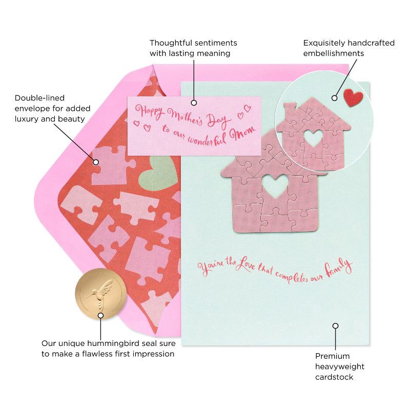 - DESIGN & FINISHINGS: This Mother's Day card showcases a layered puzzle-house die cut with a heart-shaped center and a small, raised heart embellishment. It is printed on premium heavyweight cardstock and includes handcrafted details, a double-lined patterned envelope and a decorative gold hummingbird seal for an elegant, thoughtful presentation.