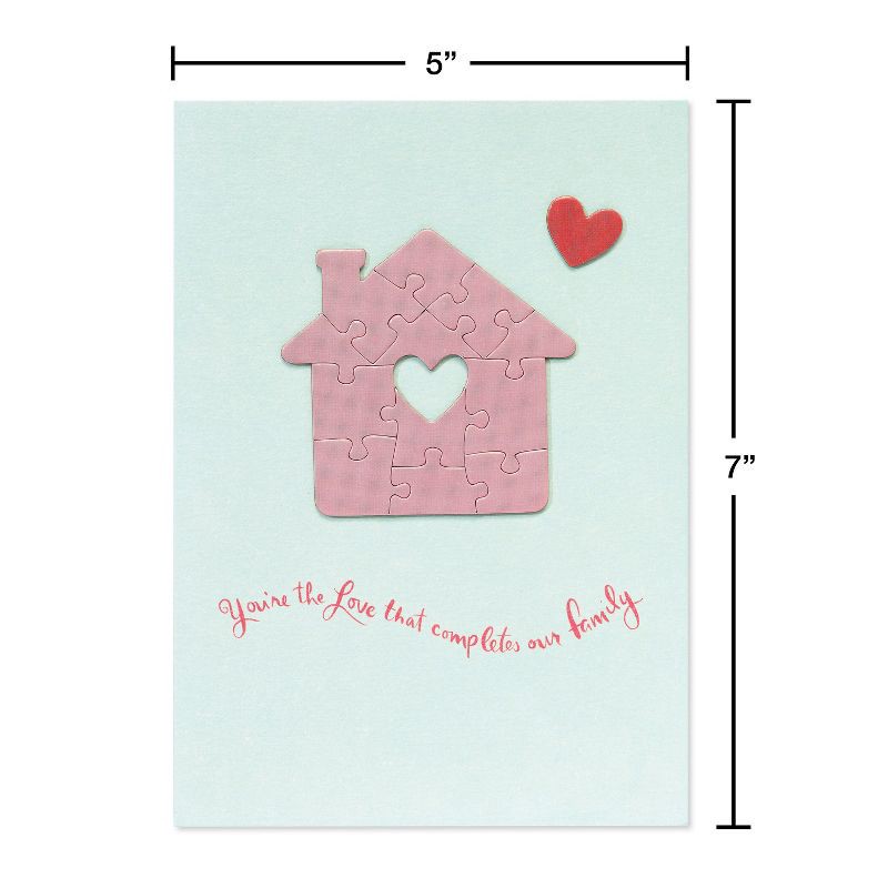 Celebrate Mother's Day with a beautiful card that tells Mom she completes your family. This elegant greeting features a charming puzzle-house motif with a heart-shaped cutout and a small, raised heart…