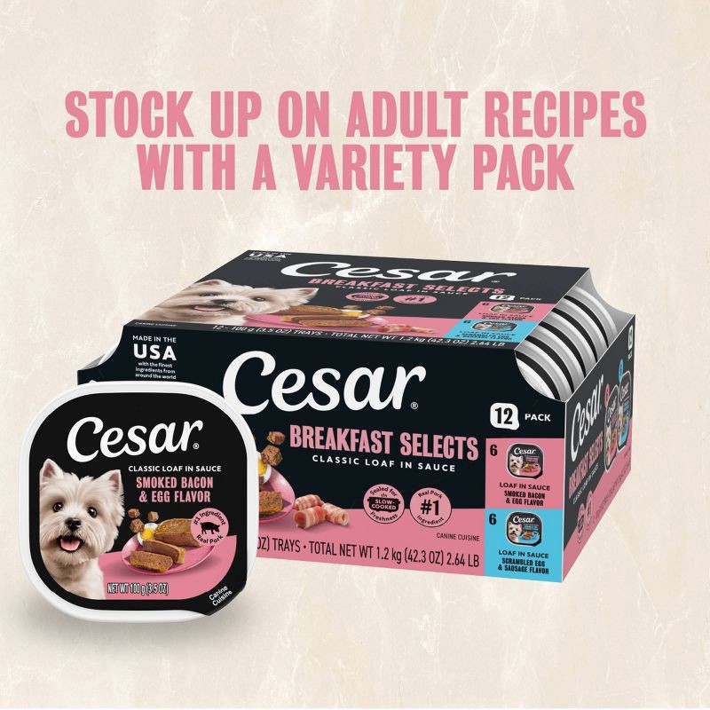 - Single: Contains one (1) 3.5 oz. tray of Cesar Classic Loaf in Sauce Wet Dog Food Bacon & Egg Flavor.