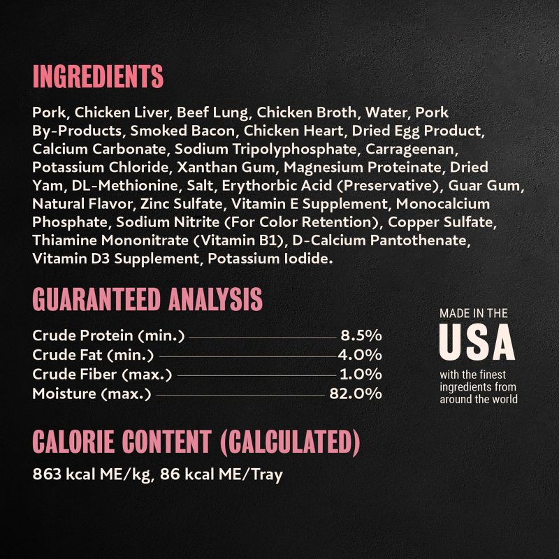 Pork, Chicken Liver, Beef Lung, Chicken Broth, Water, Pork By-Products, Smoked Bacon, Chicken Heart, Dried Egg Product, Calcium Carbonate, Sodium Tripolyphosphate, Carrageenan, Potassium Chloride, Xan…