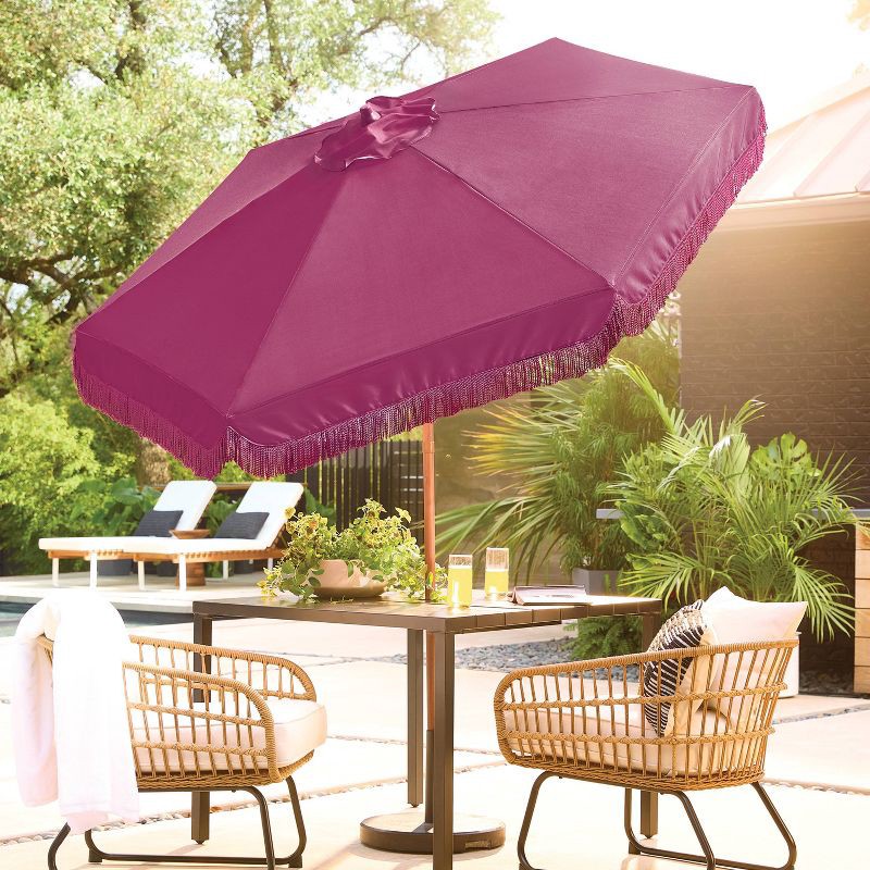 - 7.5ft round outdoor umbrella with valance fringe