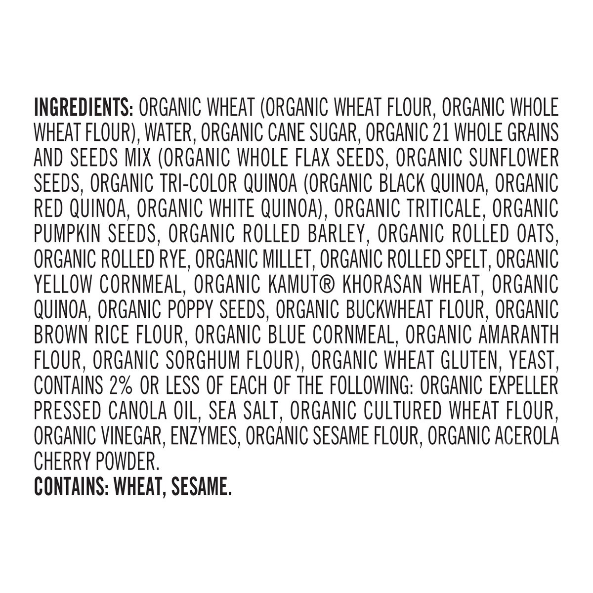 Organic Wheat (Organic Wheat Flour, Organic Whole Wheat Flour), Water, Organic Cane Sugar, Organic 21 Whole Grains and Seeds Mix (Organic Whole Flax Seeds, Organic Sunflower Seeds, Organic Tri-Color Q…