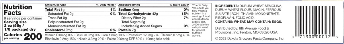 Durum Wheat Semolina, Durum Wheat Flour, Niacin, Ferrous Sulfate (Iron), Thiamin Mononitrate, Riboflavin, Folic Acid.