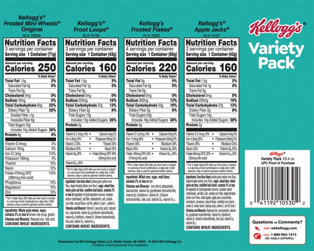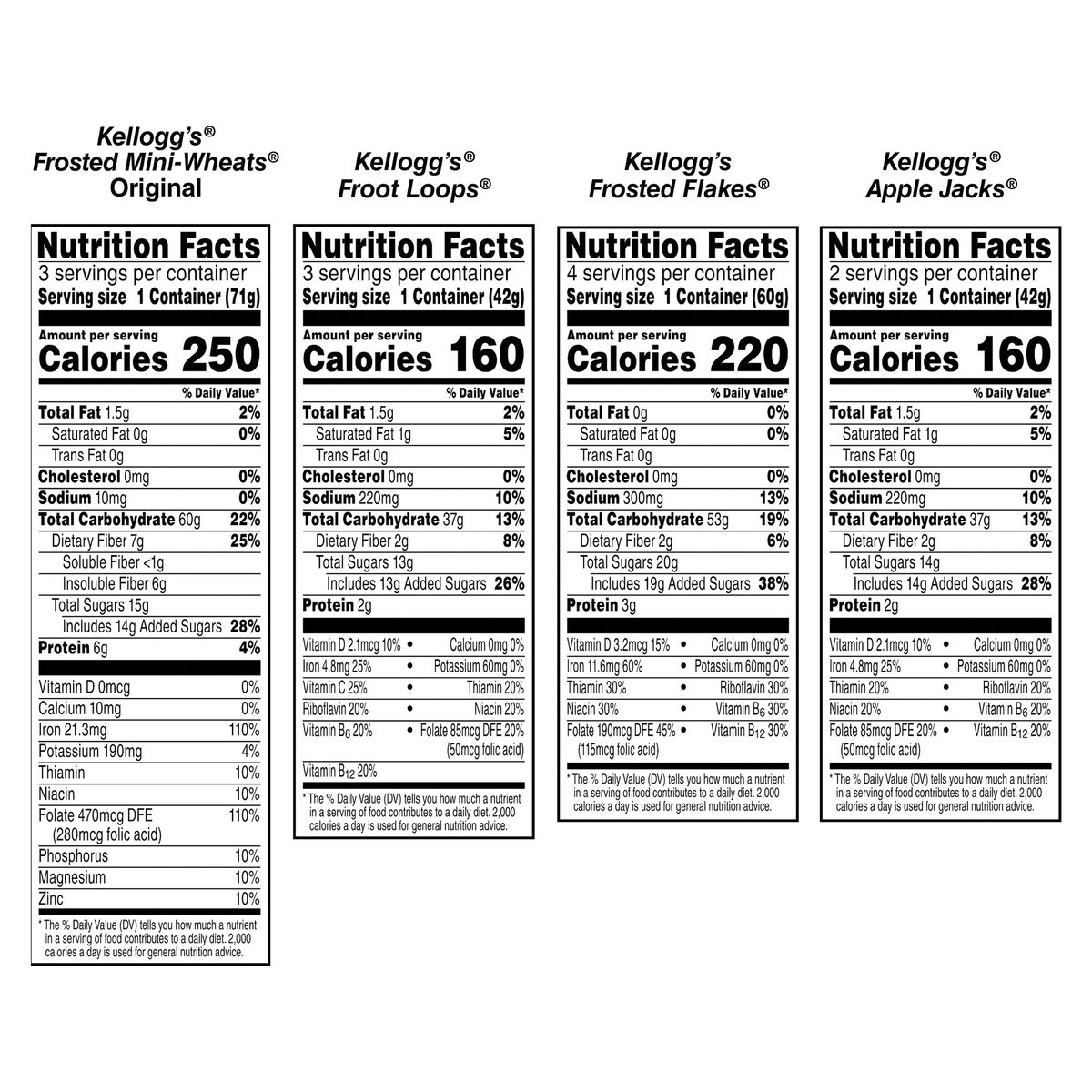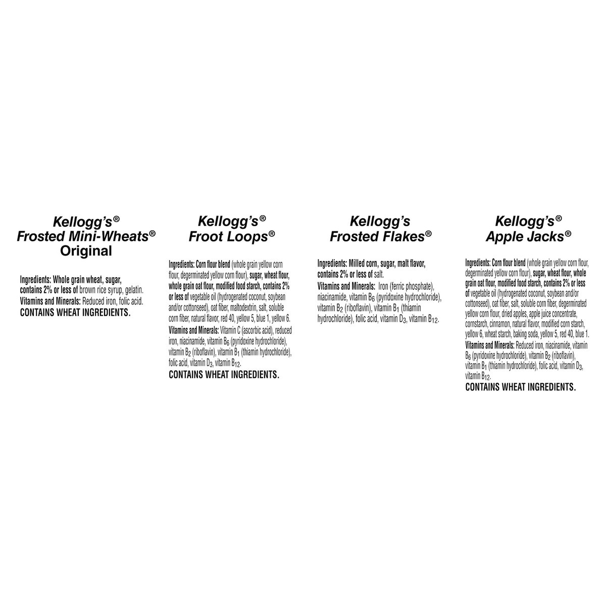 Kellogg''s Frosted Mini-Wheats Original: Whole Grain Wheat, Sugar, Contains 2% or Less of Brown Rice Syrup, Gelatin. Vitamins and Minerals: Reduced Iron, Folic Acid. Kellogg''s Froot Loops: Corn Flour…