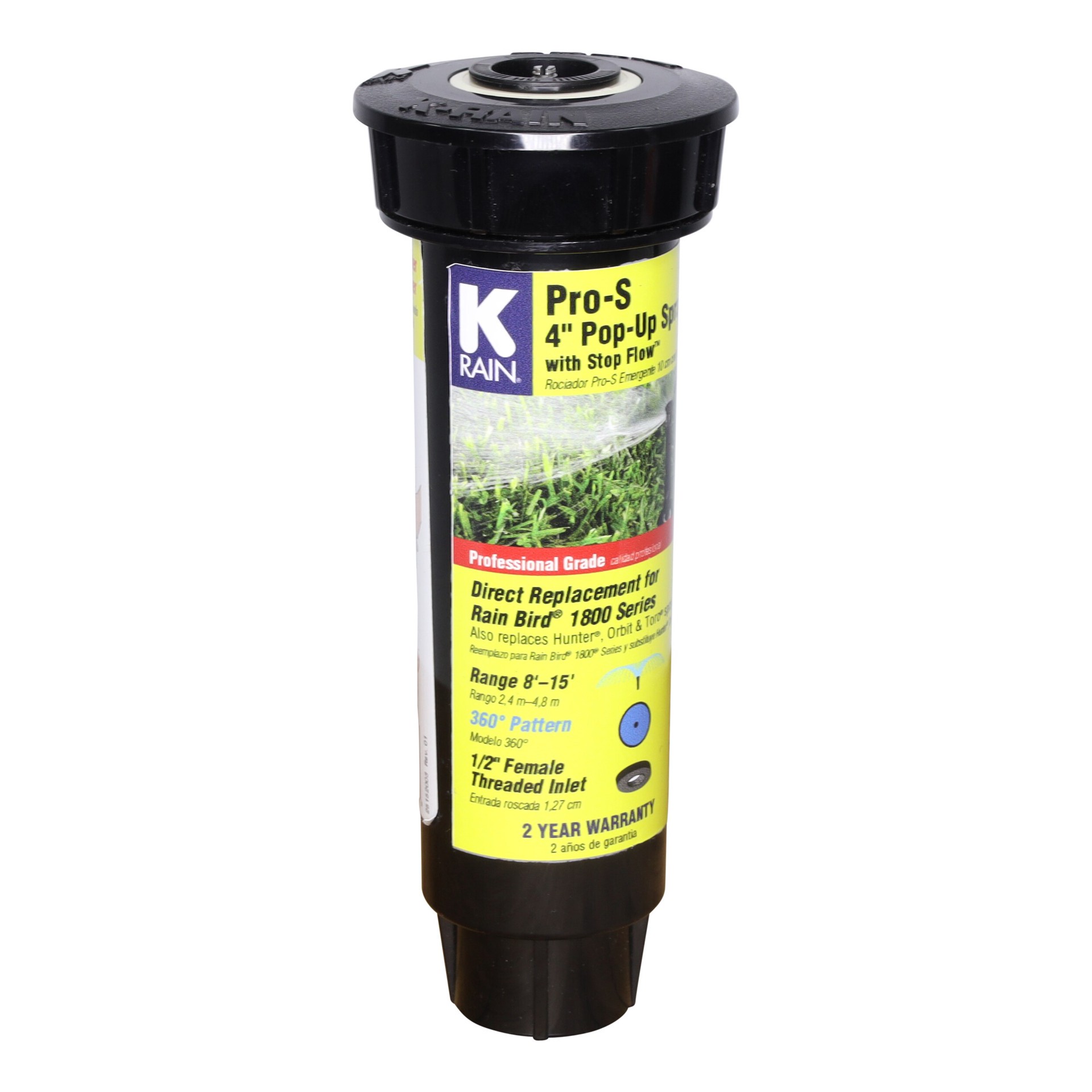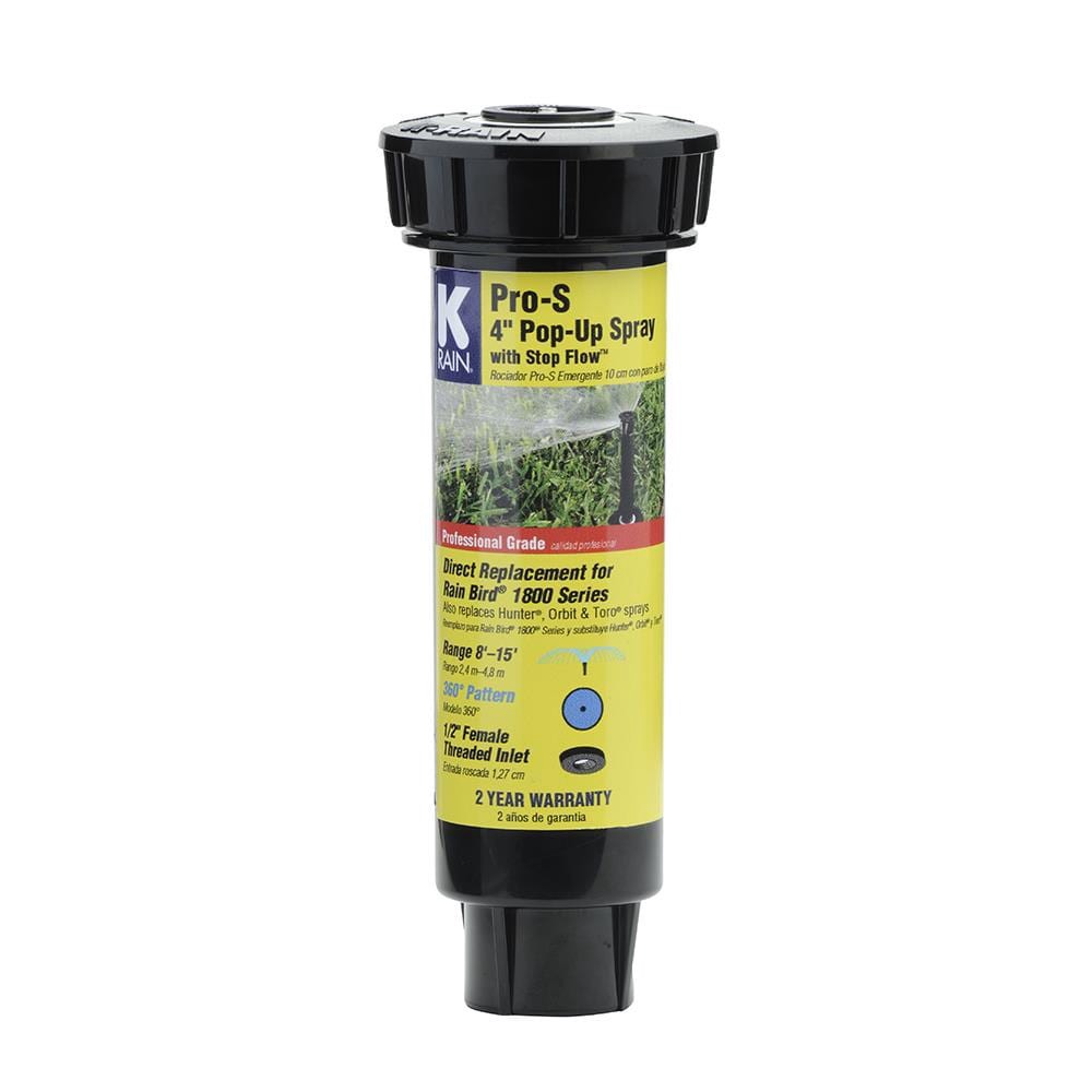 4-in Pro S spray with stop flow™ has a pre-installed 15-ft full circle nozzle, 360°. Direct replacement for Rainbird 1800 series sprays. Co-molded wiper seal ensures a leak free, full pop-up operation…