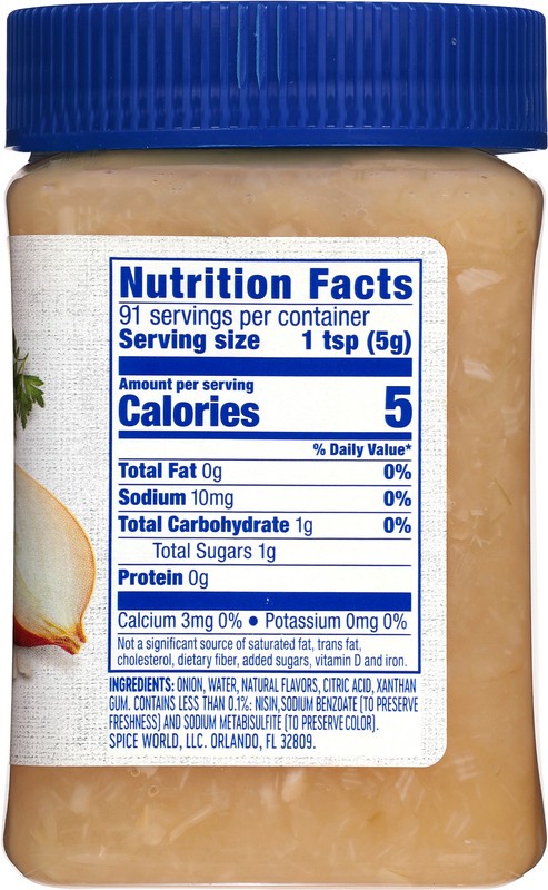 Onion, Water, Natural Flavors, Citric Acid, Xanthan Gum, Contains Less than 0.1%: Nisin, Sodium Benzoate (to Preserve Freshness) and Sodium Metabisulfite (to Preserve Color).