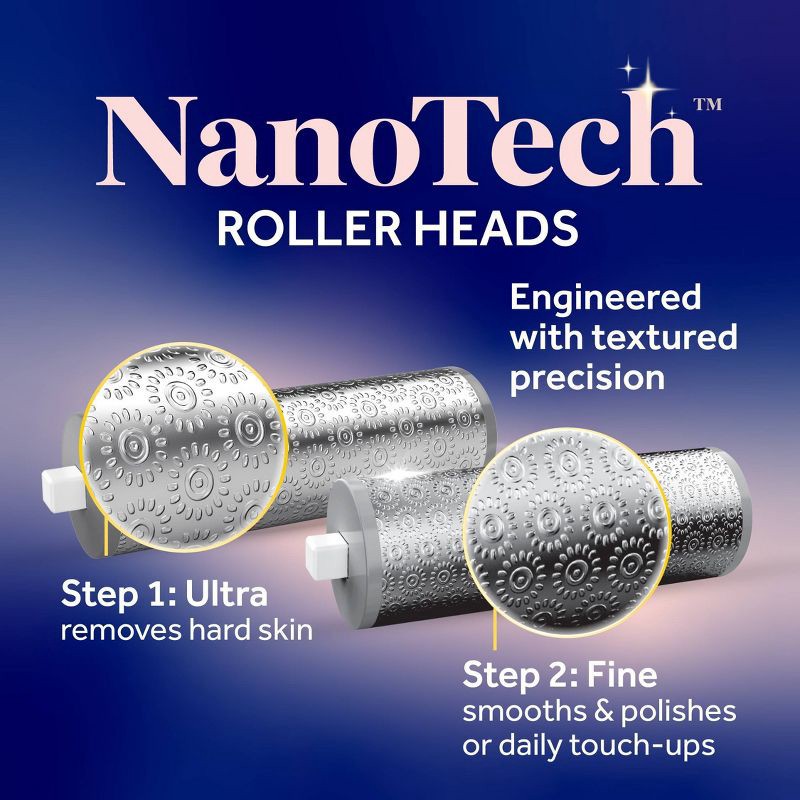 - NANOTECH ROLLER HEADS: Innovative textured rollers with multi-directional micro-grinding points effectively file and smooth callused skin at the same time, with an ultra roller head that removes the