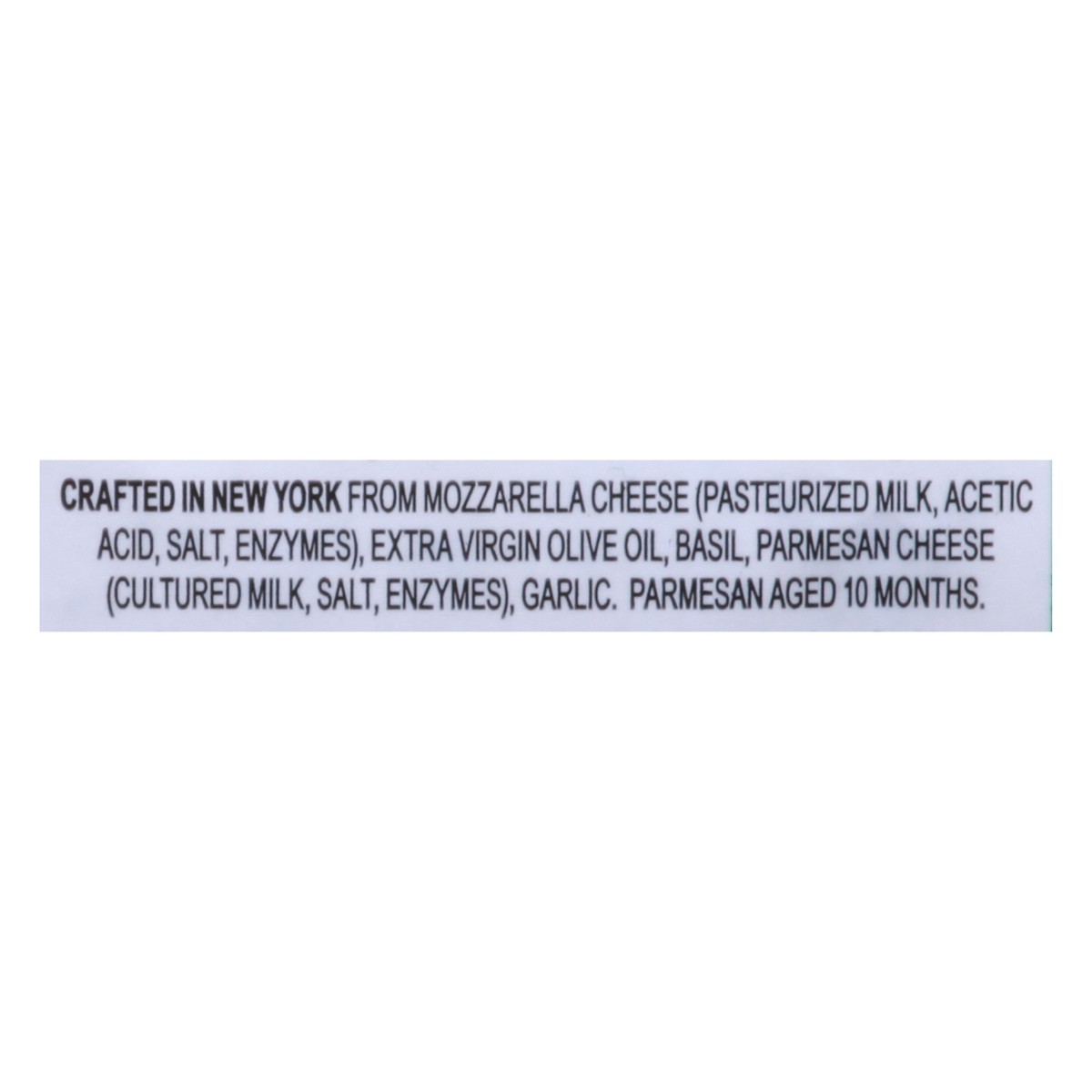 Crafted in New York from Mozzarella Cheese (Pasteurized Milk, Acetic Acid, Salt, Enzymes), Extra Virgin Olive Oil, Basil, Parmesan Cheese (Cultured Milk, Salt, Enzymes), Garlic.
