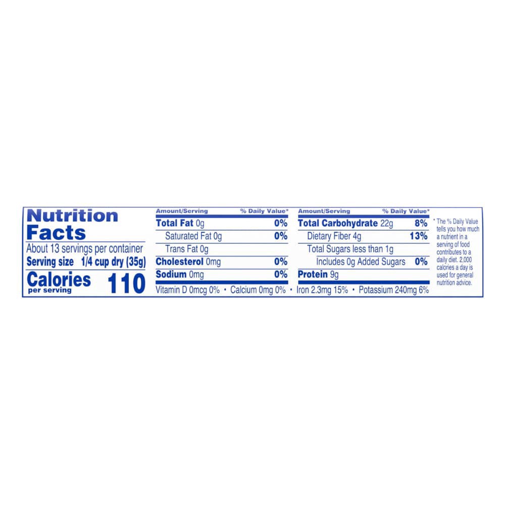 Per 1/4 Cup Dry: 80 Calories, 0g Sat Fat, 0mg Sodium, 2g SugarsHigh in FiberA Fat Free FoodKosher