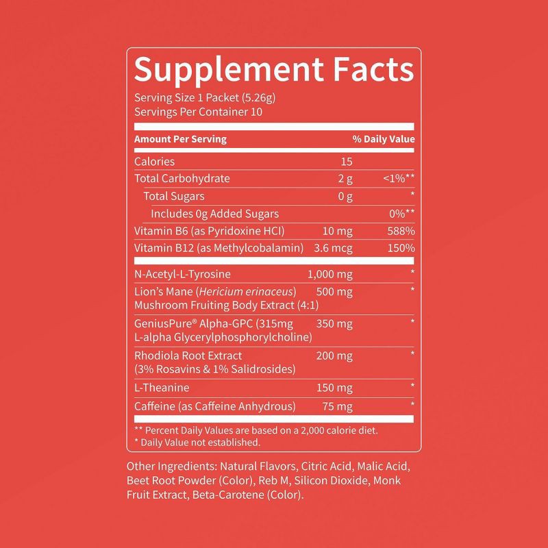 - Contains N-Acetyl-L-Tyrosine, Lion's Mane, Phosphatidylserine, Rhodiola Rosea, and GeniusPure® Alpha-GPC