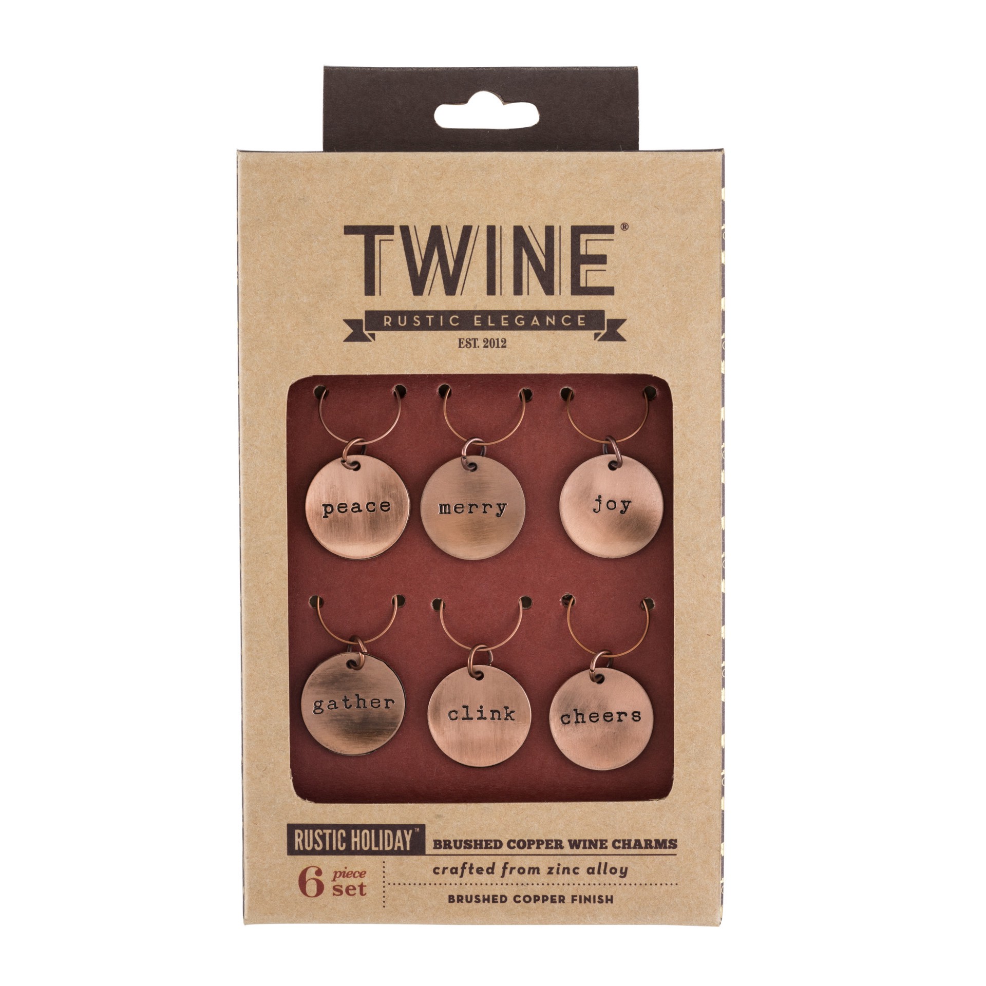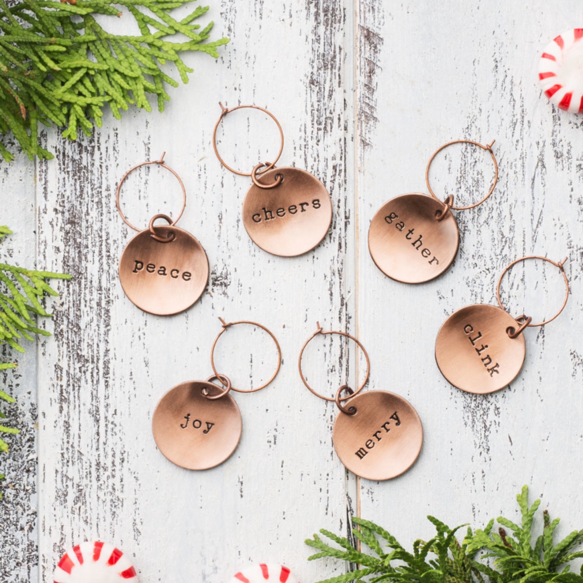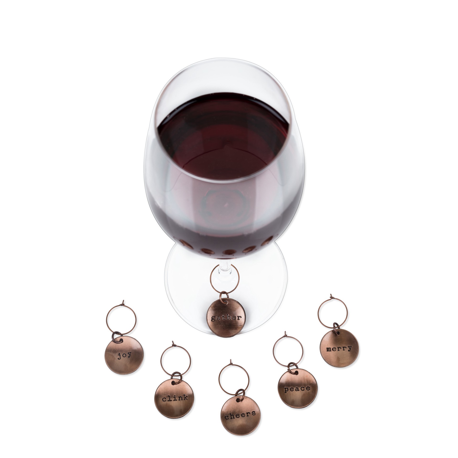 Brushed copper creates a burnished sheath around this set of six seasonal wine charms, bringing an element of sophistication to any holiday feast. Marked with a festive phrase, each circular tag is gu…