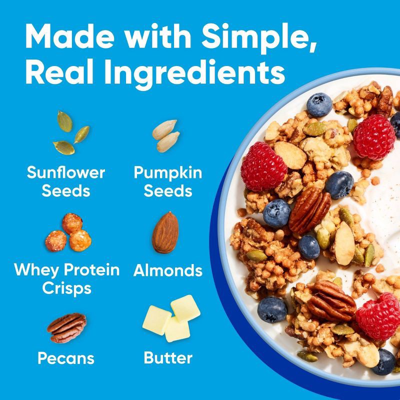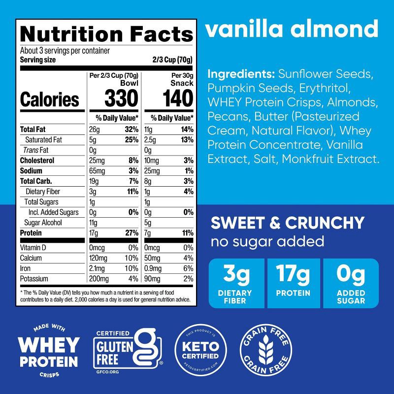 SUNFLOWER SEEDS, PUMPKIN SEEDS, ERYTHRITOL, WHEY PROTEIN CRISPS (WHEY PROTEIN CONCENTRATE, TAPIOCA STARCH), ALMONDS, PECANS, BUTTER (PASTEURIZED CREAM, NATURAL FLAVOR), WHEY PROTEIN CONCENTRATE, VANIL…