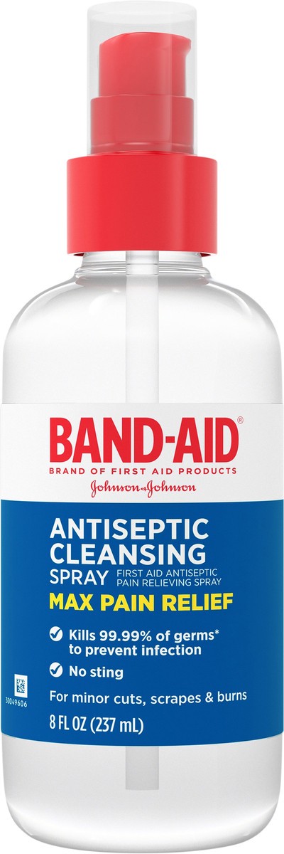 Band-Aid Brand Pain Relieving Antiseptic Cleansing Spray helps clean and relieve the pain of minor cuts\, burns\, and scrapes. Formulated with the topical analgesic pramoxine HCl\, this pain relieving…