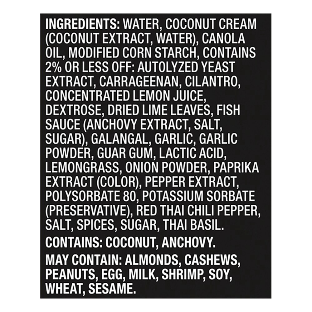 Water, Coconut Cream (Coconut Extract, Water), Canola Oil, Modified Corn Starch, Contains 2% or Less of: Autolyzed Yeast Extract, Carrageenan, Cilantro, Concentrated Lemon Juice, Dextrose, Dried Lime …