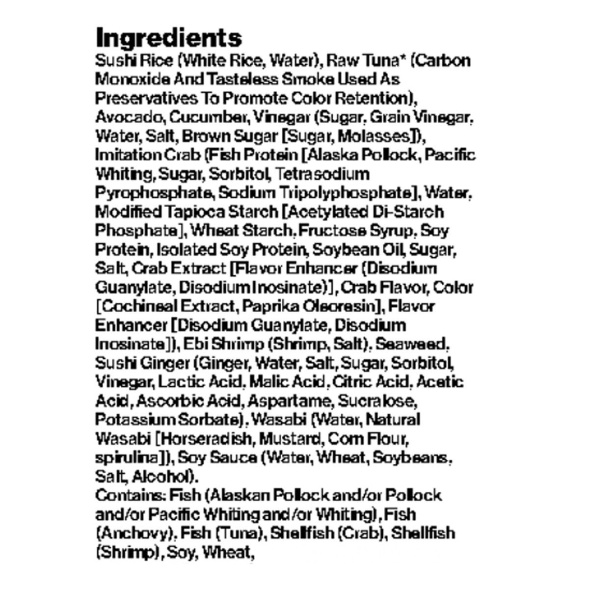 Sushi Rice (White Rice, Water), Raw Tuna (This Product Contains Raw Fish, Consuming Raw or Undercooked Seafood May Increase Your Risk of Food Borne Illness) (Carbon Monoxide and Tasteless Smoke Used a…