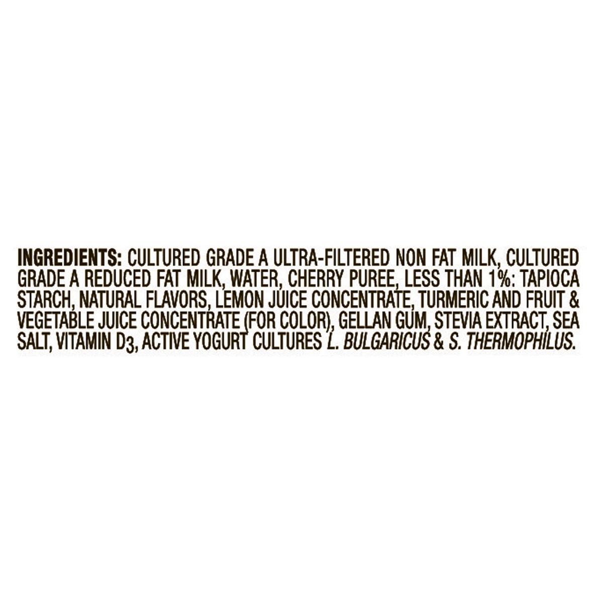 Cultured Grade A Ultra-Filtered Non Fat Milk, Cultured Grade A Reduced Fat Milk, Water, Cherry Puree, Less than 1%: Tapioca Starch, Natural Flavors, Lemon Juice Concentrate, Turmeric and Fruit & Veget…