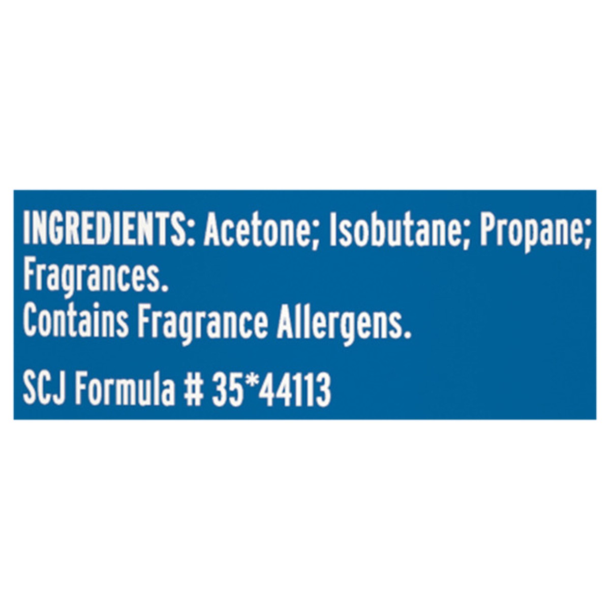 INGREDIENTS: Acetone; Isobutane; Propane; Fragrances.Contains Fragrance Allergens. SCJ Formula # 35*44113