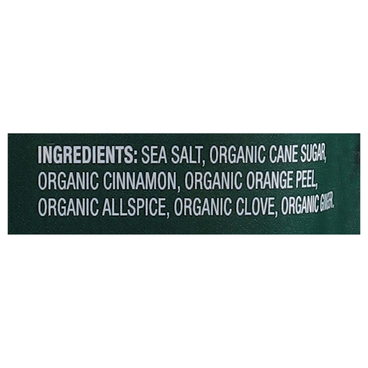 Sea Salt, Organic Cane Sugar, Organic Cinnamon, Organic Orange Peel, Organic Allspice, Organic Clove, Organic Ginger.