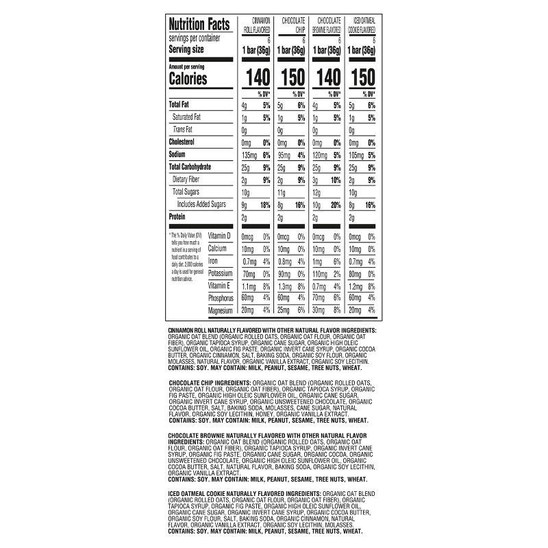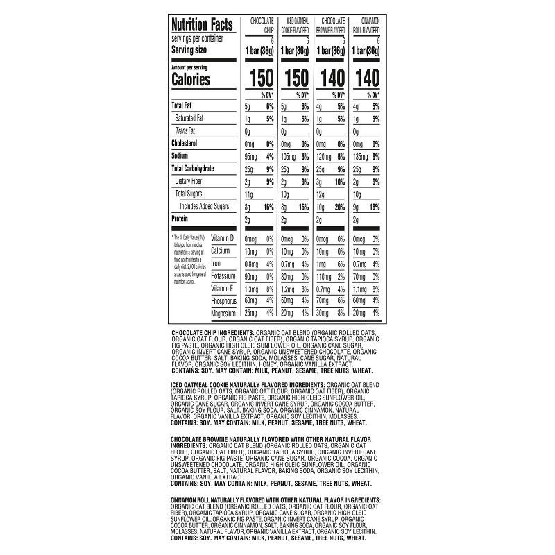 CHOCOLATE CHIP - CHOCOLATE CHIP: ORGANIC OAT BLEND (ORGANIC ROLLED OATS, ORGANIC OAT FLOUR, ORGANIC OAT FIBER), ORGANIC TAPIOCA SYRUP, ORGANIC FIG PASTE, ORGANIC HIGH OLEIC SUNFLOWER OIL, ORGANIC CANE…