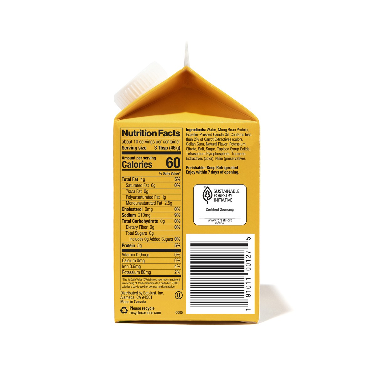 Water, Mung Bean Protein, Expeller-Pressed Canola Oil, Contains Less than 2% of Dehydrated Onion, Gellan Gum, Carrot Extractives (Color), Natural Flavors, Turmeric Extractives (Color), Potassium Citra…