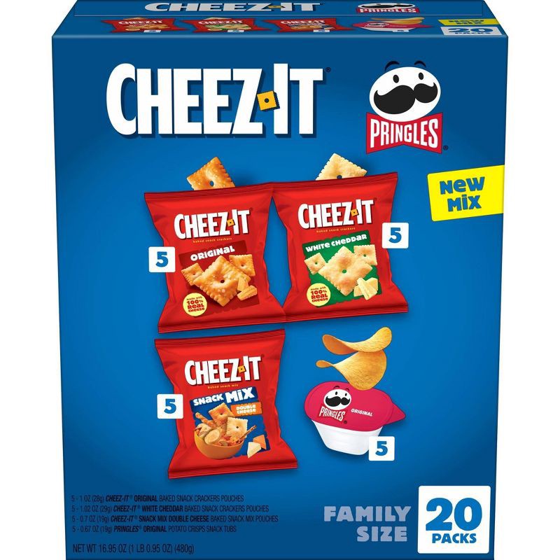 - Variety pack includes Cheez-It Original, Cheez-It White Cheddar, Cheez-It Double Cheese Snack Mix, and Pringles Original