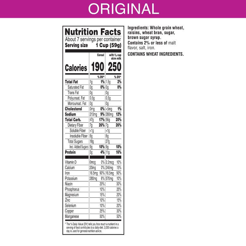 Whole Grain Wheat, Raisins, Wheat Bran, Sugar, Brown Sugar Syrup, Contains 2% or Less of Malt Flavor, Salt, Iron