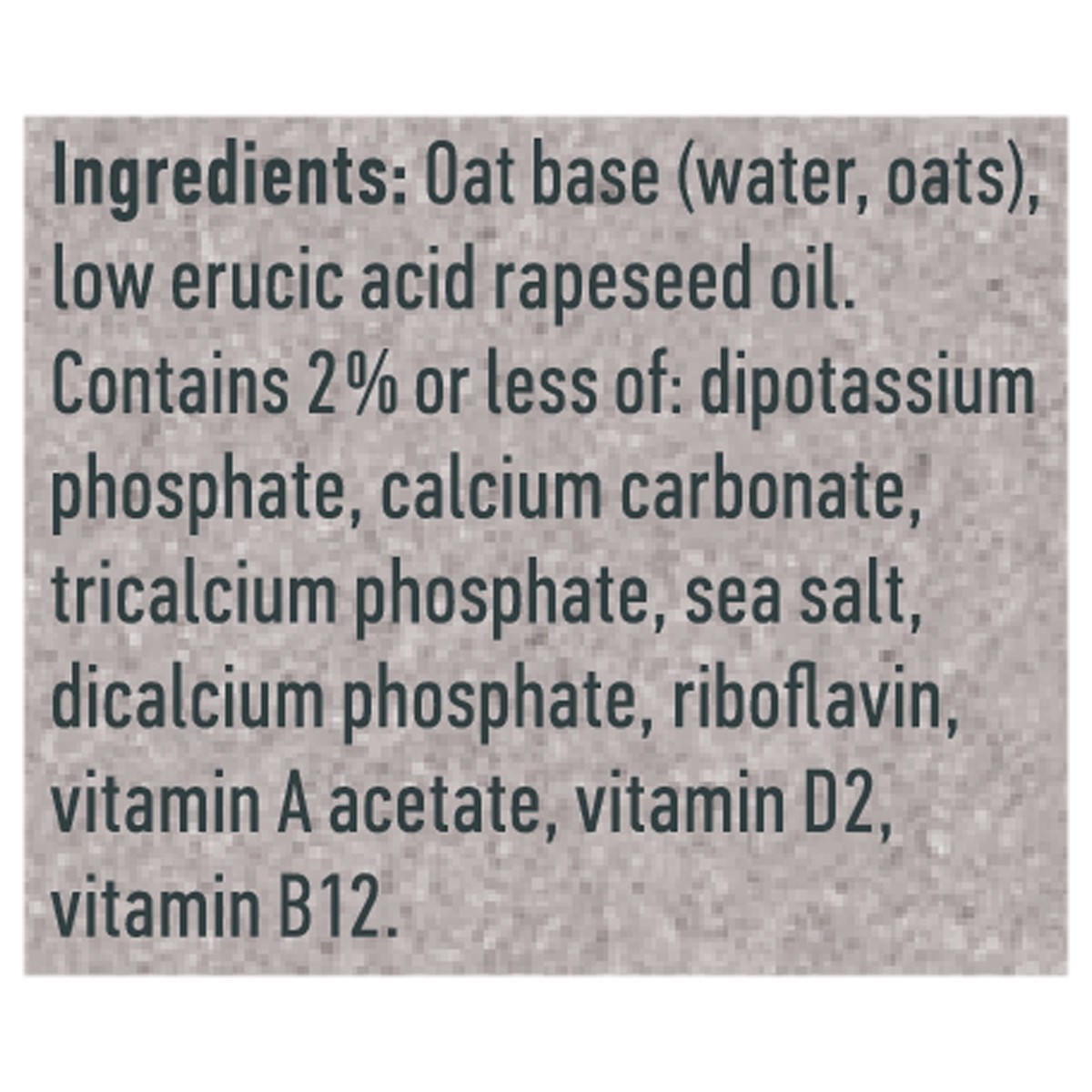Oat Base (Water, Oats), Low Erucic Acid Rapeseed Oil, Contains 2% or Less of: Dipotassium Phosphate, Calcium Carbonate, Tricalcium Phosphate, Sea Salt, Dicalcium Phosphate, Riboflavin, Vitamin A Aceta…
