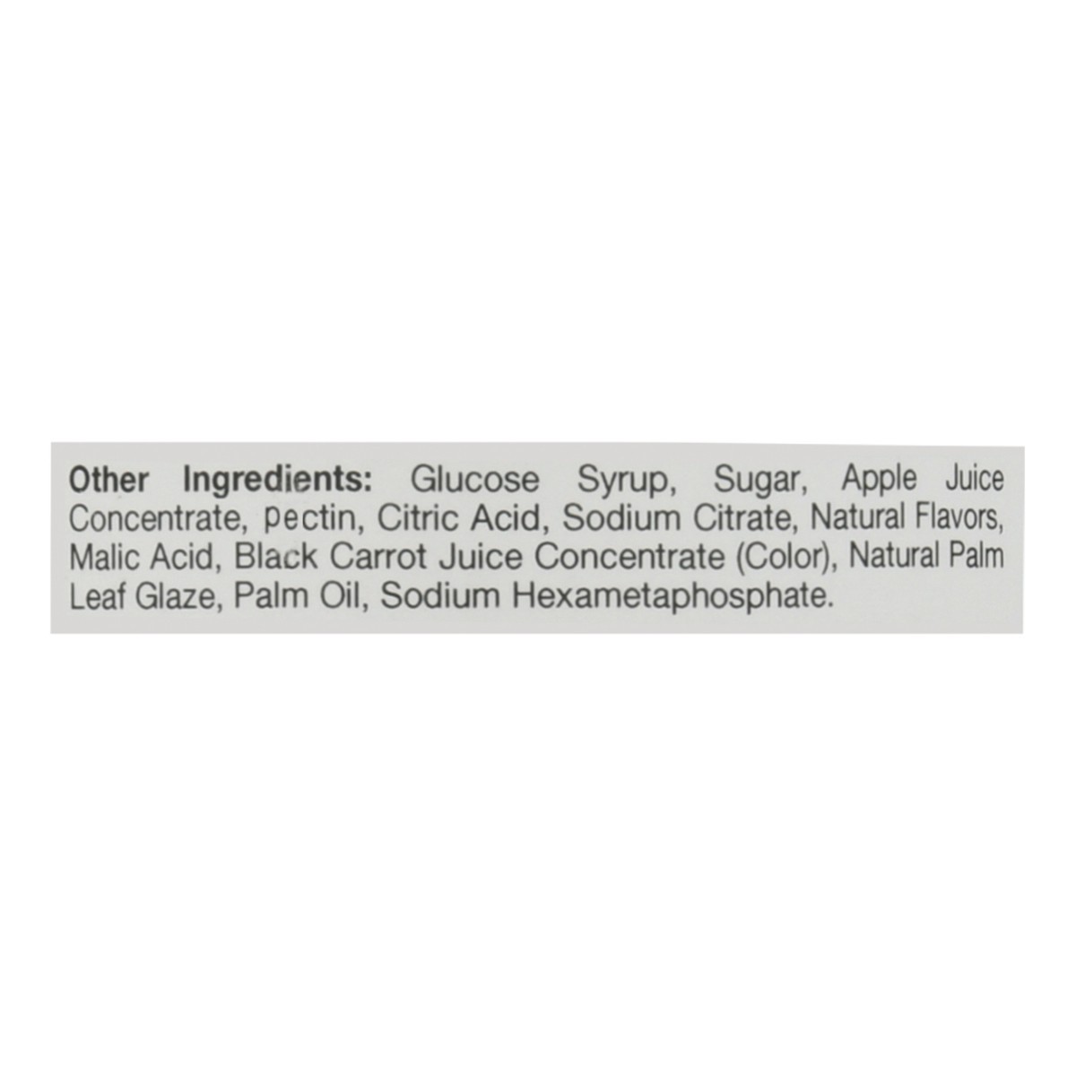 Other Ingredients: Glucose Syrup, Sugar, Apple Juice Concentrate, Pectin, Citric Acid, Sodium Citrate, Natural Flavors, Malic Acid, Black Carrot Juice Concentrate (Color), Natural Palm Leaf Glaze, Pal…