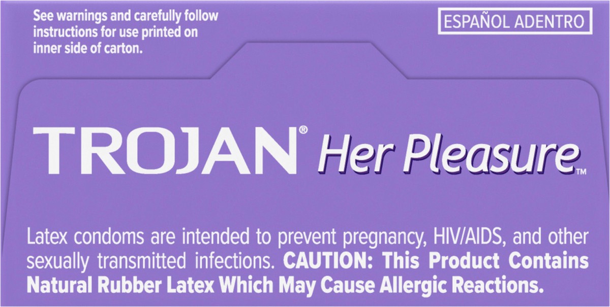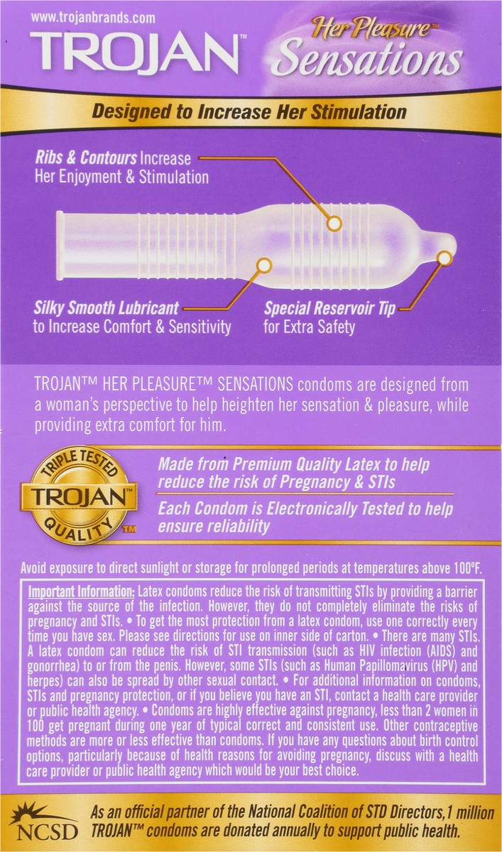 Trojan Her Pleasure Sensations Condoms are designed from a woman's perspective to help heighten her sensation while providing extra comfort for men. They are uniquely ribbed and contoured for extra st…