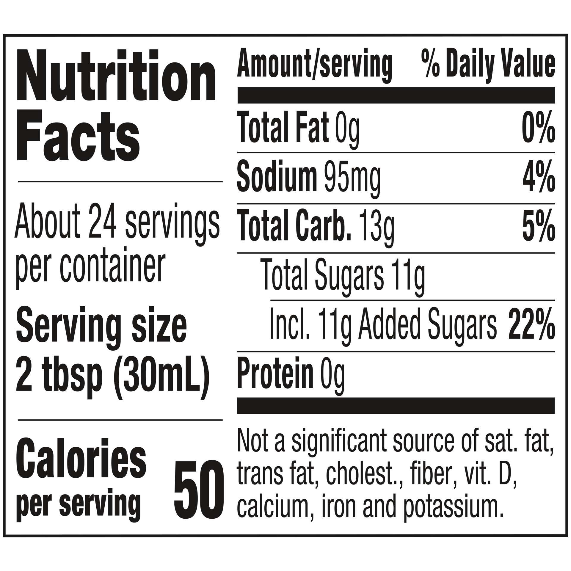 50 calories per 2 tbsp. Calories/serving: Lite: 50. Regular: 110. Reduced calorie syrup. 45% fewer calories than our original syrup. A family tradition since 1887. Traditional rich taste. No high fruc…