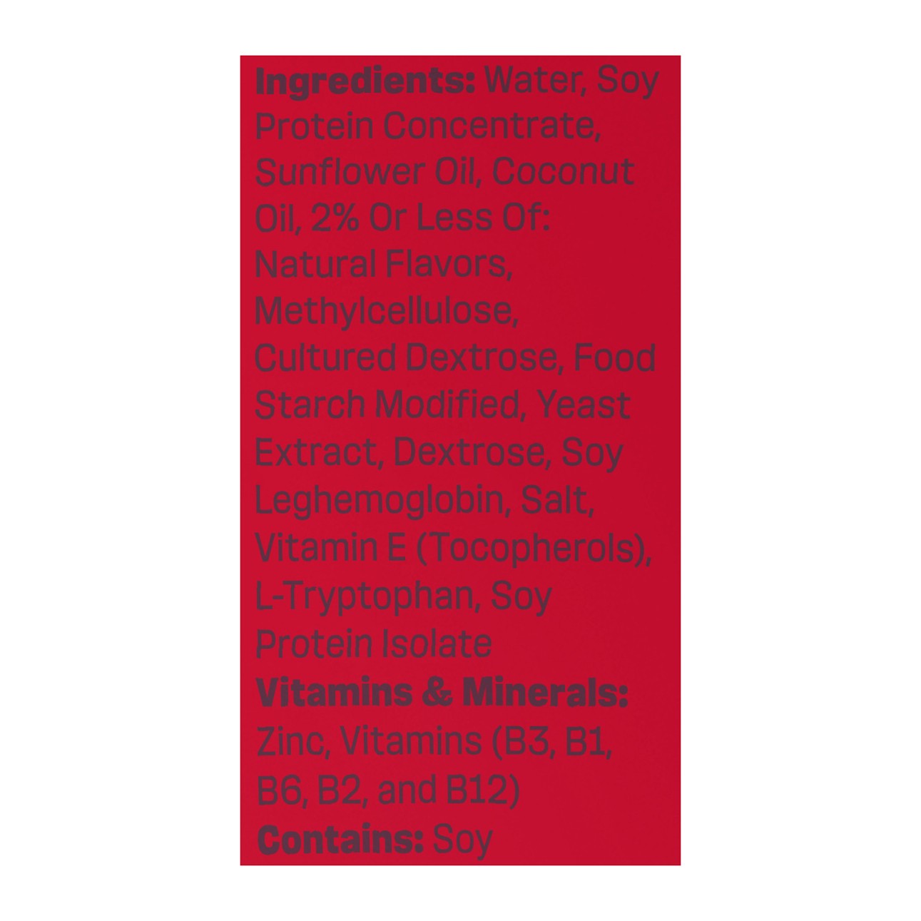 Ingredients: Water, Soy Protein Concentrate, Sunflower Oil, Coconut Oil, 2% Or Less Of: Natural Flavors, Methylcellulose, Cultured Dextrose, Food Starch Modified, Yeast Extract, Dextrose, Soy Leghemog…