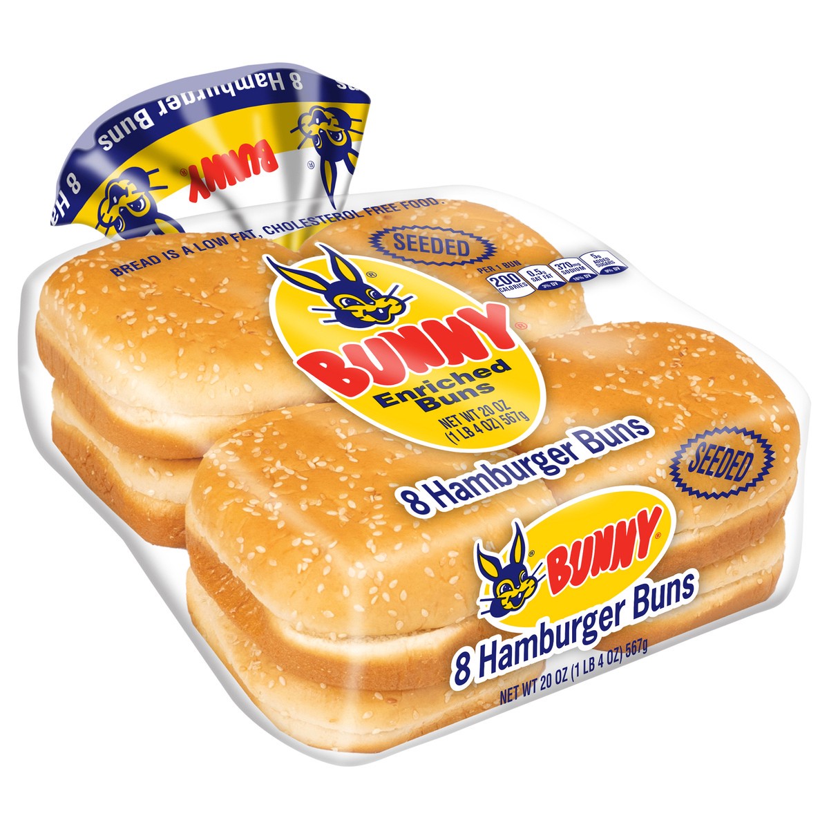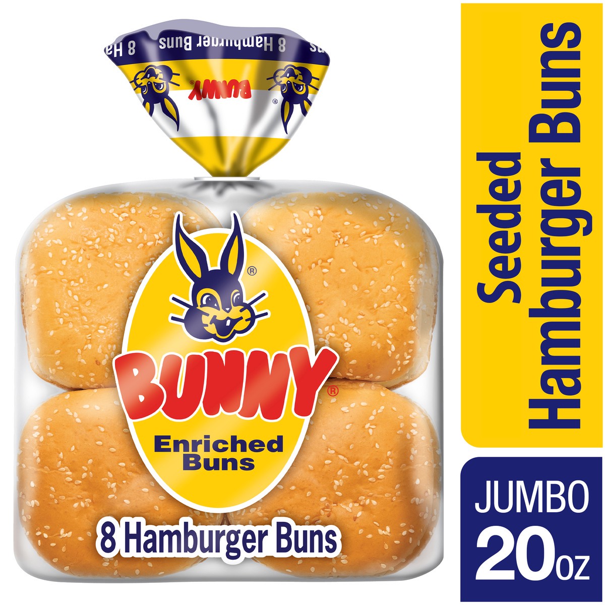 Bunny Bread Seeded Hamburger Buns, Enriched Sliced White Bread Hamburger Buns, 8 Count