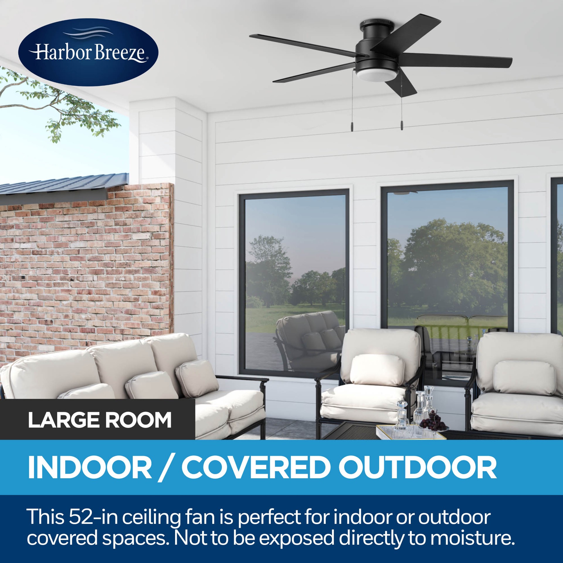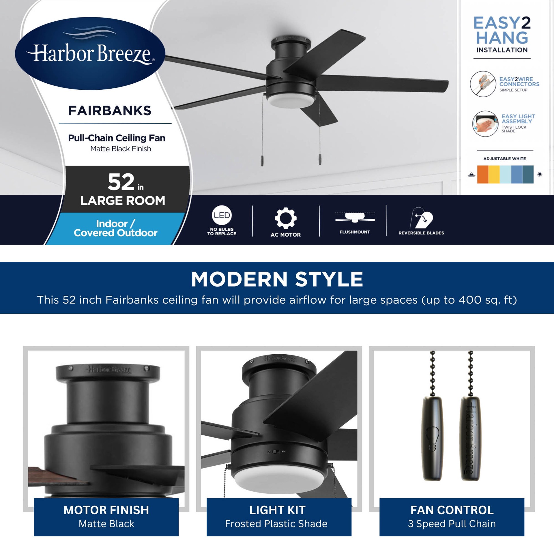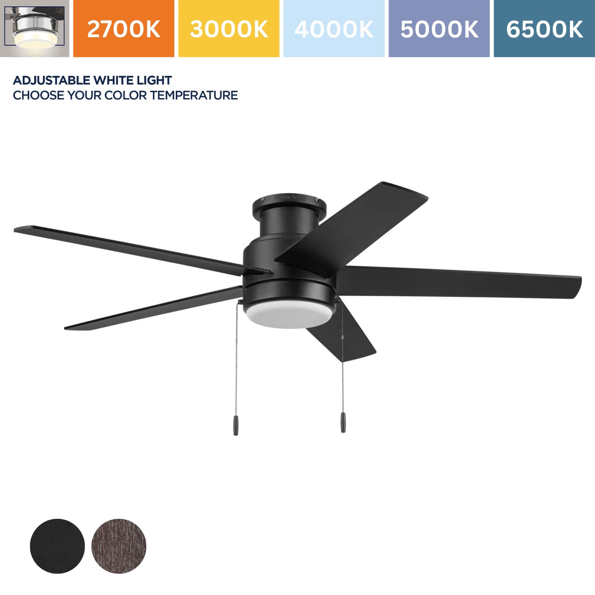 Harbor Breeze Fairbanks Easy2Hang 52-in Matte Black with Black/Sable Blades Adjustable White LED Covered Outdoor Flush Mount Ceiling Fan With Light and Pull Chain Included 5 -Blade