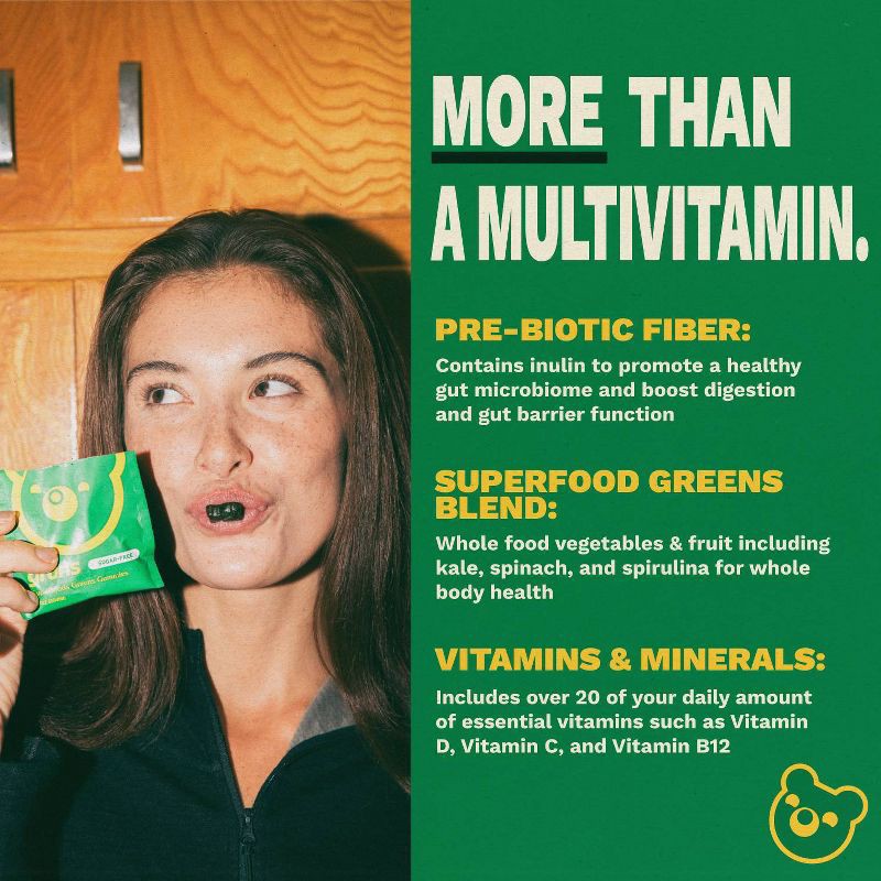 - NO MESS, NO STRESS: Grüns is thoughtfully formulated to be a delicious and seamless addition to your daily routine with our convenient individual snack packs. Each pack contains 8 tasty gummy bears so there's no more cobbling together handfuls of supplements. Enjoy the delightful flavor and benefits of our comprehensive nutrition gummies anytime, anywhere - making it easy to get nutrition on the go!