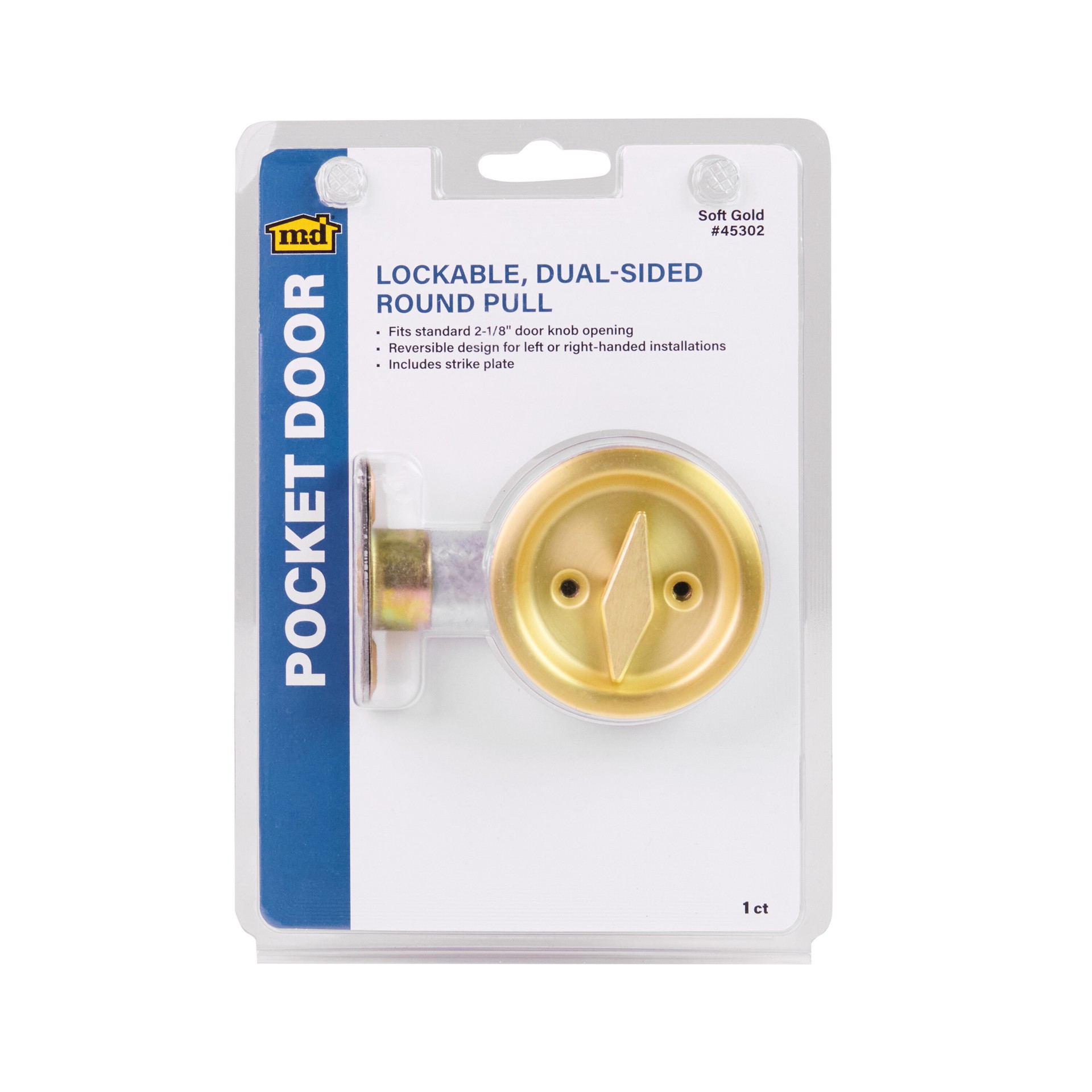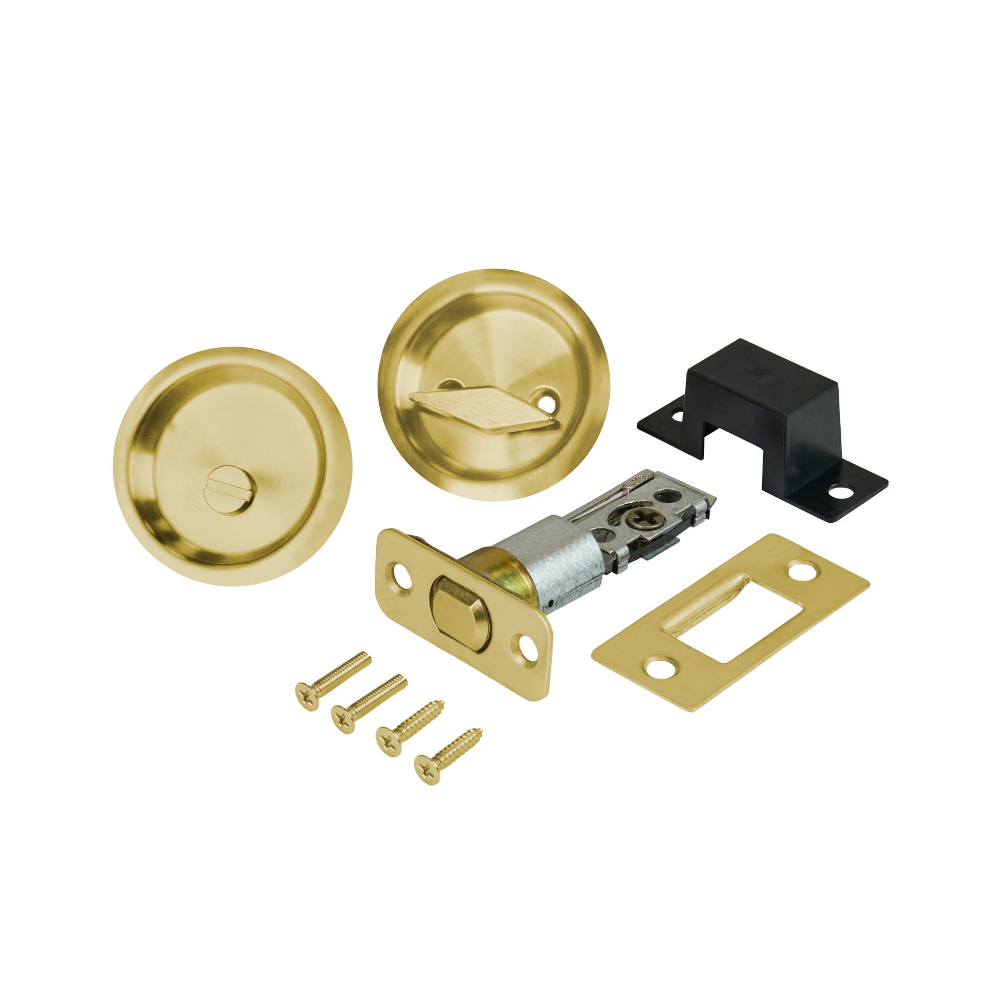 Round privacy pocket door pull. Steel construction. 2-1/8" wide fits in standard door knob hole. Steel. Soft Gold finish. Use on interior pocket doors. Privacy lock. Installs with Phillips head screwd…