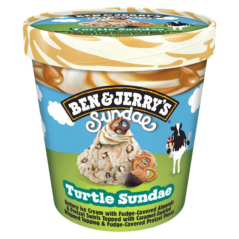 - Ben & Jerry's Turtle Sundae Buttery Ice Cream Pint with Fudge covered almonds, pretzel swirls, topped with caramel swirled whipped topping and fudge covered pretzel pieces