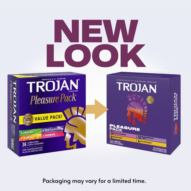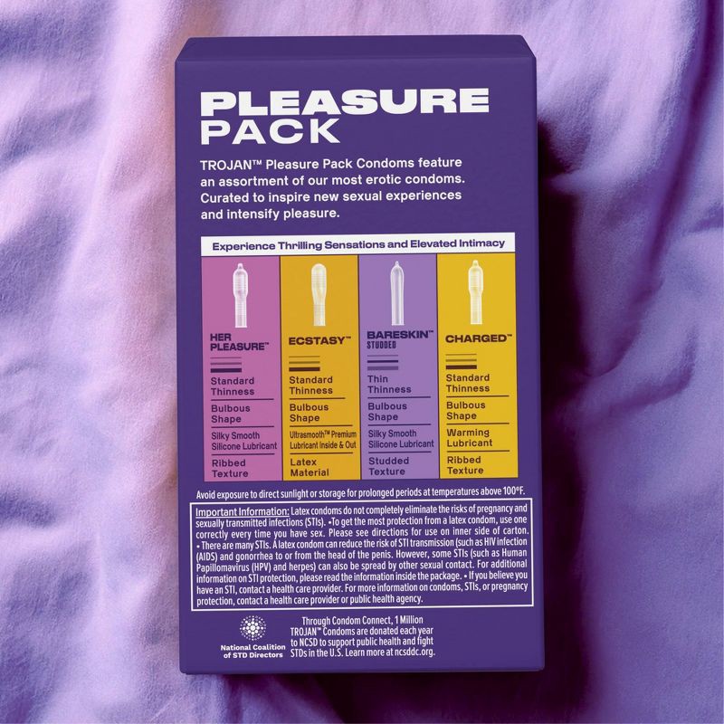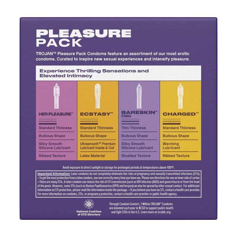 - Trojan Pleasure Pack includes a variety of our most erotic condoms curated to inspire new sexual experiences and intensify pleasure