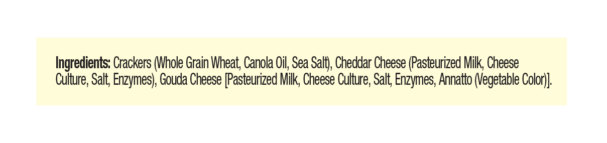 Crackers (Whole Grain Wheat, Canola Oil, Sea Salt), Cheddar Cheese (Pasteurized Milk, Cheese Culture, Salt, Enzymes), Gouda Cheese [Pasteurize Milk, Cheese Culture, Salt, Enzymes, Annatto (Vegetable C…