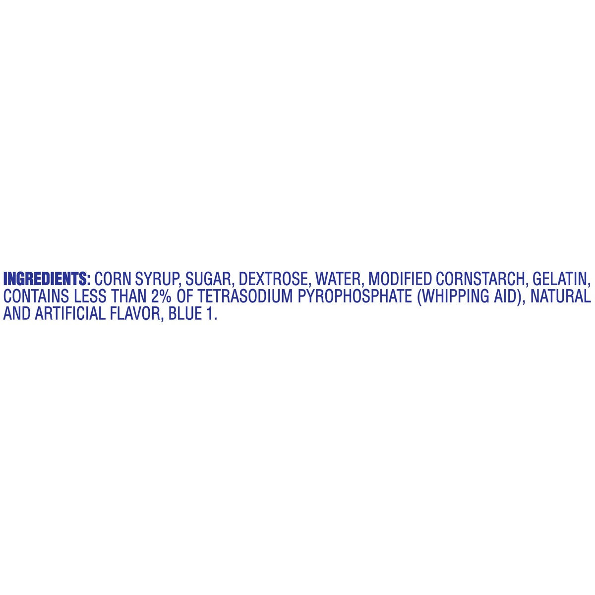 Corn Syrup, Sugar, Dextrose, Water, Modified Cornstarch, Gelatin, Contains Less than 2% of Tetrasodium Pyrophosphate (Whipping Aid), Natural and Artificial Flavor, Blue 1.