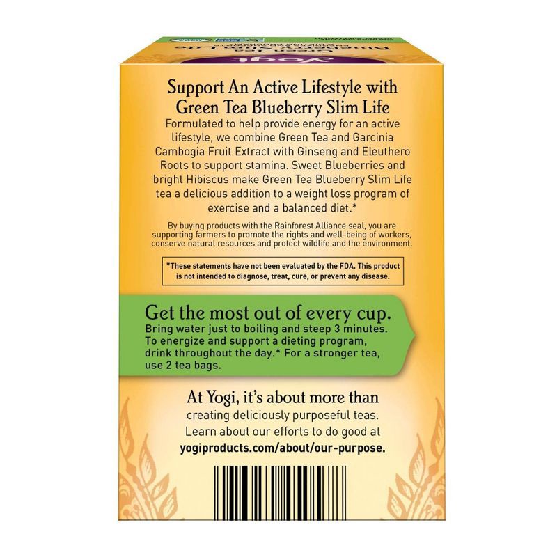 Formulated to help provide energy for an active lifestyle while dieting, Yogi Green Tea Blueberry Slim Life tea combines Green Tea and Garcinia Cambogia Fruit Extract with Panax Ginseng Root and Eleut…