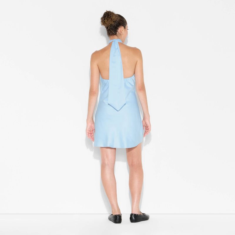 Satin mini slip dress from Wild Fable™ in a solid shade. Features a high neckline with a keyhole twist-front accent and adjustable behind-the-neck trailing bow ties. Made from extra-lightweight recycl…