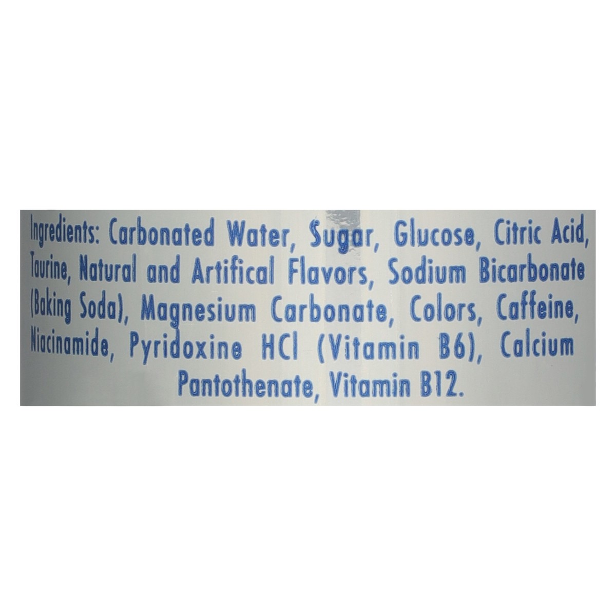 Carbonated Water, Sugar, Glucose, Citric Acid, Taurine, Natural and Artificial Flavors, Sodium Bicarbonate (Baking Soda), Magnesium Carbonate, Colors, Caffeine, Niacinamide, Pyridoxine HCl (Vitamin B6…