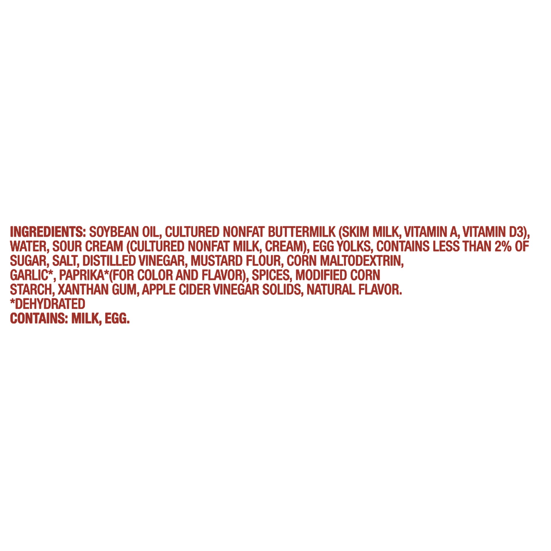 SOYBEAN OIL, CULTURED NONFAT BUTTERMILK (SKIM MILK, VITAMIN A, VITAMIN D3), WATER, SOUR CREAM (CULTURED NONFAT MILK, CREAM), EGG YOLKS, CONTAINS LESS THAN 2% OF SUGAR, SALT, DISTILLED VINEGAR, MUSTARD…